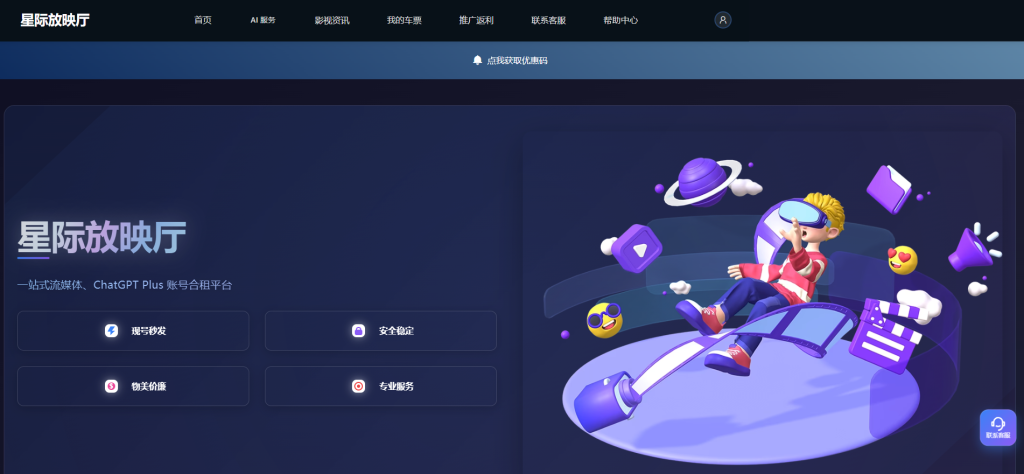 星际放映厅是一家由专业团队运营,为用户提供安全可靠的流媒体和AI工具合租服务的平台,该平台已获得正规ICP备案(浙ICP备2023017856号),星际放映厅虽然主打Netflix、HBO Max、Disney+、Prime Video、YouTube Premium等流媒体合租服务,但同时提供ChatGPT Plus合租、ChatGPT Plus代充值、SuperGrok合租和代充值、Midjourney合租、Midjourney代充值、Poe代充值等服务。也就是说,无论你是想追剧、看美剧、听音乐,还是需要AI写作与绘画,用户都能在这里找到合适的方案。