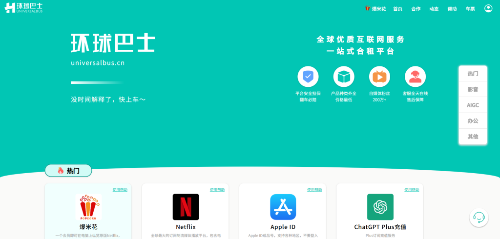环球巴士(UniversalBus)成立于2019年7月,前身为“奈飞站”(NetflixStation),是一家专注于流媒体账号合租和AI工具服务的综合平台。目前环球巴士的服务范围从最初的奈飞合租扩展到近20种服务,用户规模突破10万。