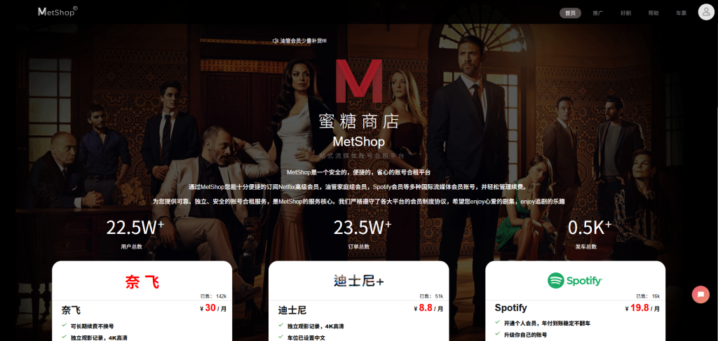 蜜糖商店(MetShop)是一家一站式流媒体合租平台,可以通过蜜糖商店合租奈飞、迪士尼+、Spotify、YouTube、HBO、Hulu等国外知名平台的会员账号。方便国内无法自己完成订阅的网友,实现低价格的合租!蜜糖商店总用户量超22万+,总订单量超23万+,可以说是一个非常热门的合租平台。