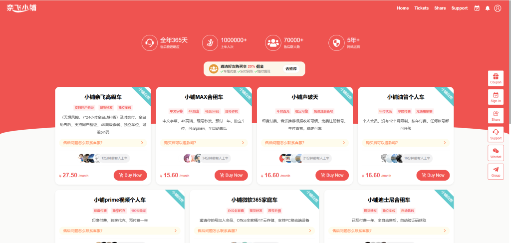 奈飞小铺可以算是最早提供专业合租奈飞(Netflix)服务的平台,规模较大,用户数也很多,发车超过10万次。平台内自营的主要有Netflix,Youtube,HBO,Disney+流媒体,还有Spotify音乐平台的账号共享服务。