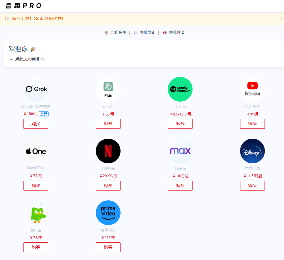 因为这些流媒体普遍价格高,直接订阅有难度等原因,所以有一些提供合租业务的平台就应运而生了。而这些网站除了提供以上这些平台的合租、代充业务外,也会提供其它一些服务,比如ChatGPT、Office 365等软件的合租或者代充。